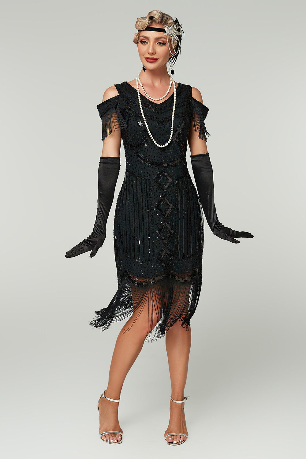 Glitrende sort koldskulder-pailletkort kjole fra 1920'erne med frynser