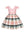 En linje V hals pink blomst trykt lang brudepige kjole med flæser